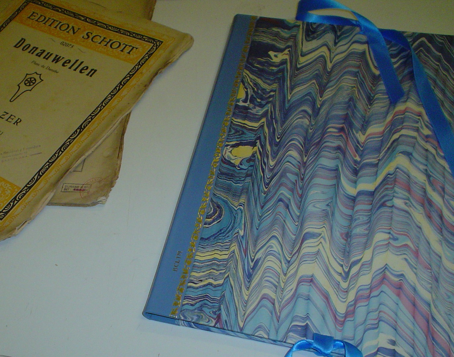 En esta ocasión llegaron a mis manos dos libros de partituras musicales de principios del siglo XX. Uno de ellos no tenía tapa y el otro una tapa estilo Art decó estampada en color sobre tela.